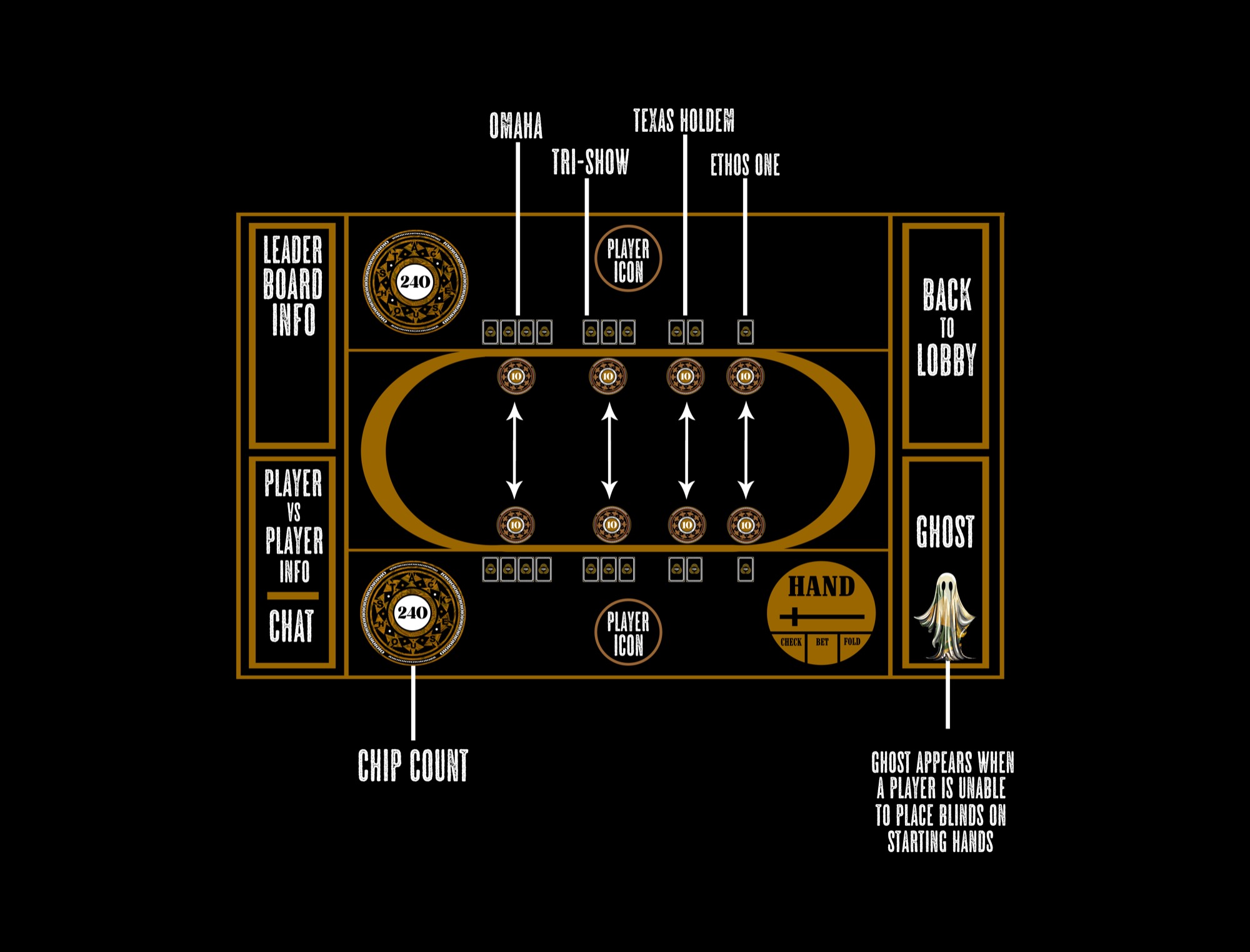 GHOST   The ghost appeares when a player is unable to put blinds on starting hands. When this happens play runs straight through to showdown on the first hand in play (Ethos One). If the ghosting player wins this hand they are able to use the chip for further hands available as blinds or betting. This continues through the hands.