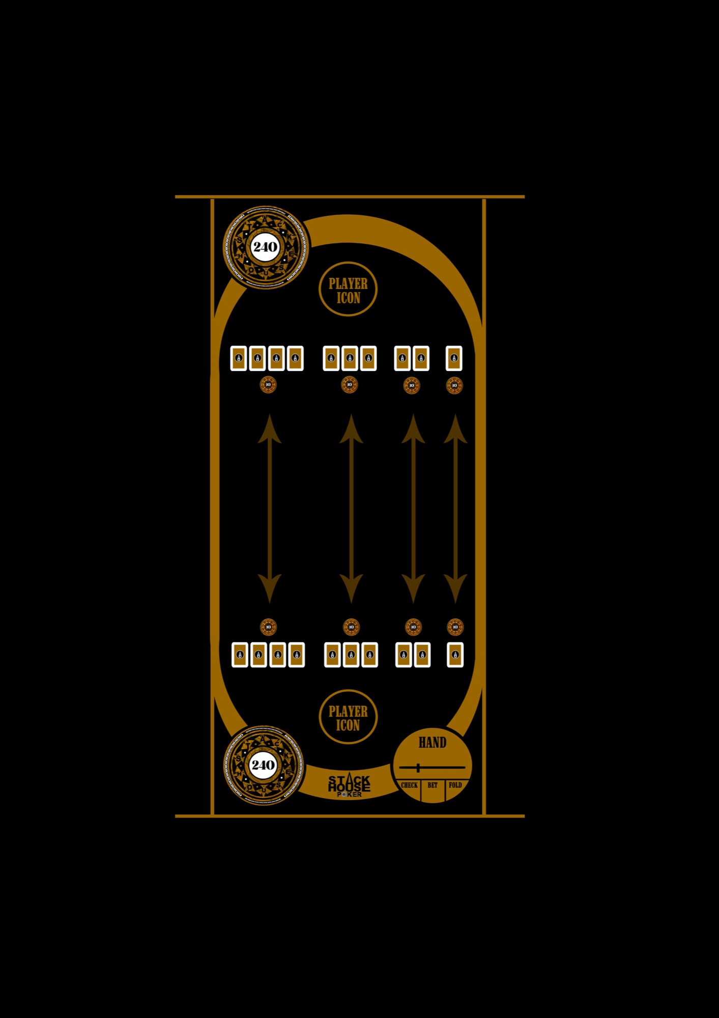 Both players start with a minimum of 240 chips. Every chip is worth 10. To start the game, one chip is placed on every hand acting as blinds.